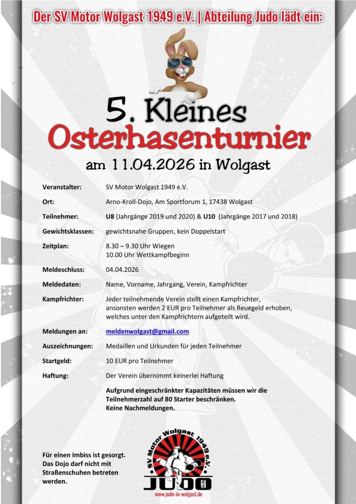 Anlässlich des 70-jährigen Bestehens der Abteilung Judo des SV Motor Wolgast trägt das Judoteam MV (KGJMV) am 28.03.2026 ab 16.00 Uhr seine Bundesligakämpfe der Männer- und Frauenmannschaft in Wolgast aus.