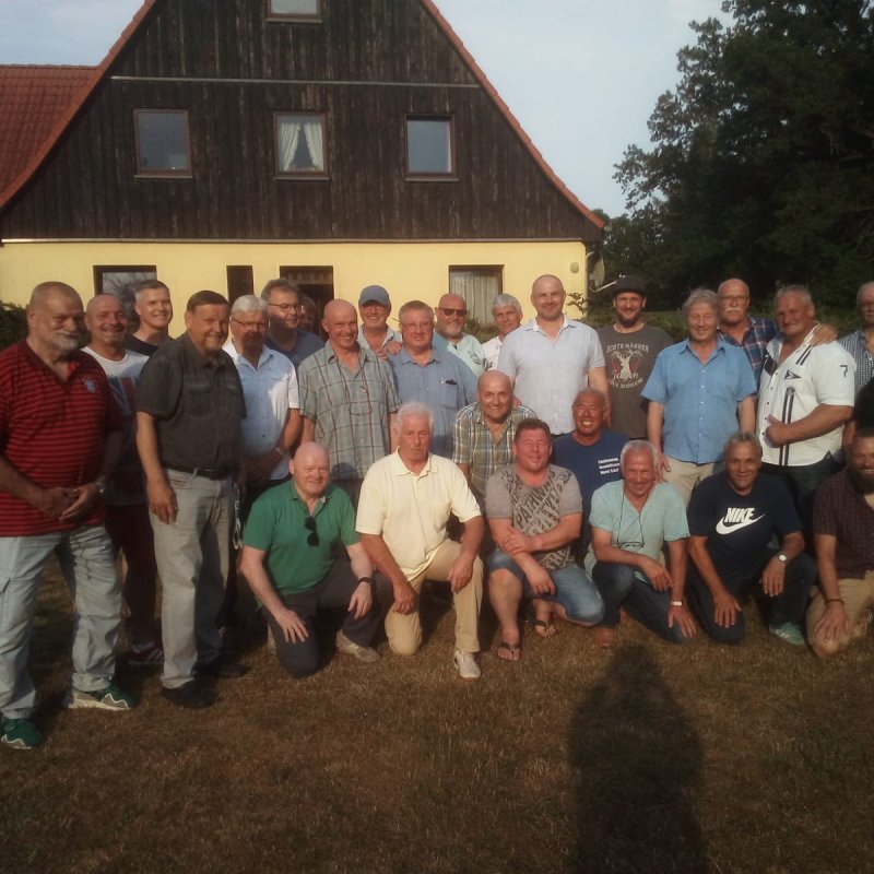 die ehemaligen Judokas unserer Abteilung in Jägerhof bei Wolfgang Oehmichen. Insgesamt 32 Sportler fanden sich bei Bier und Schwein am Spieß zusammen.