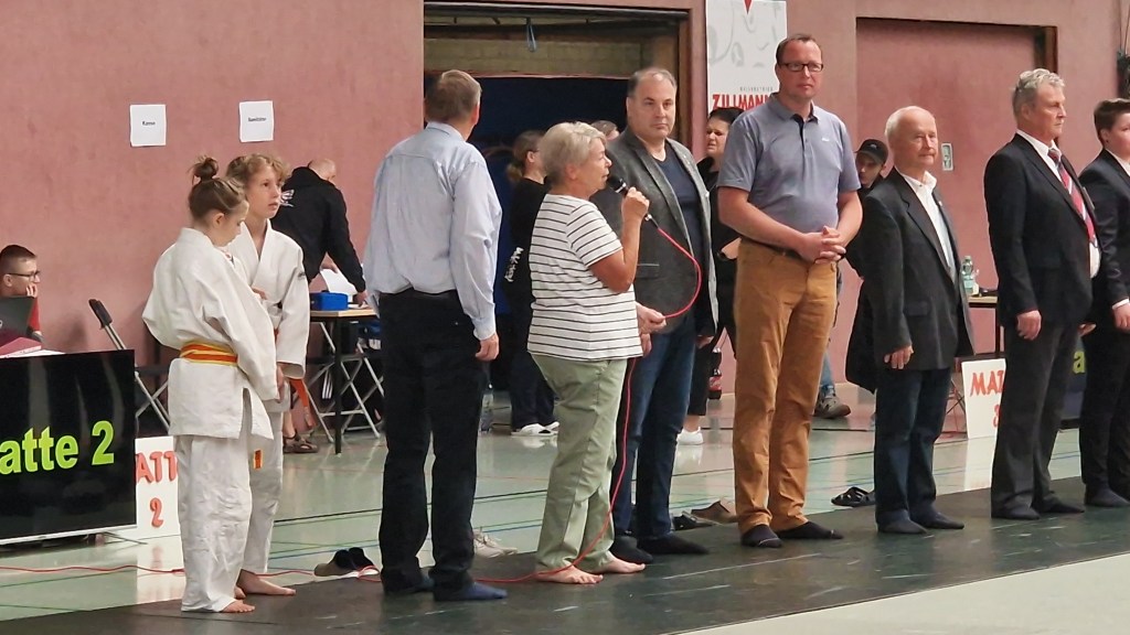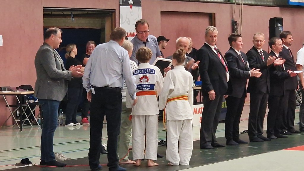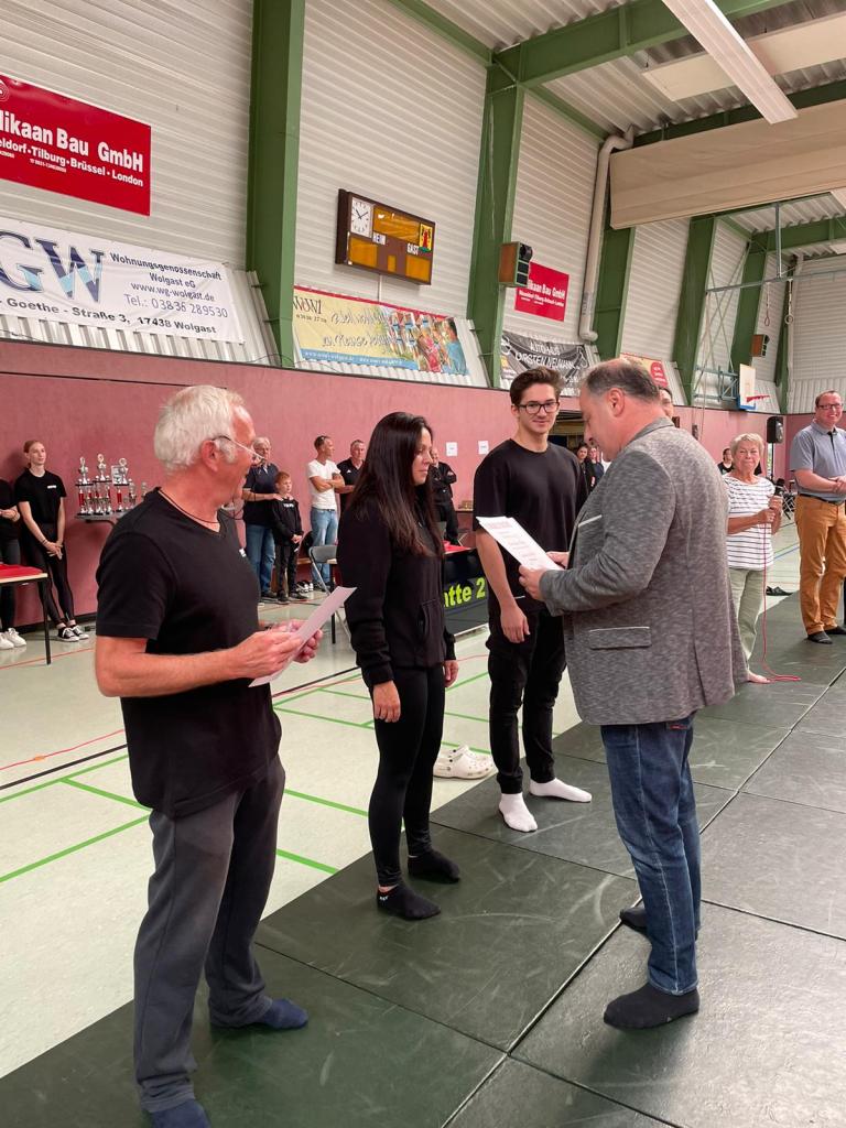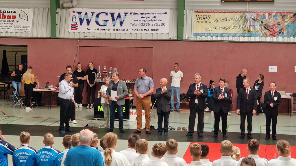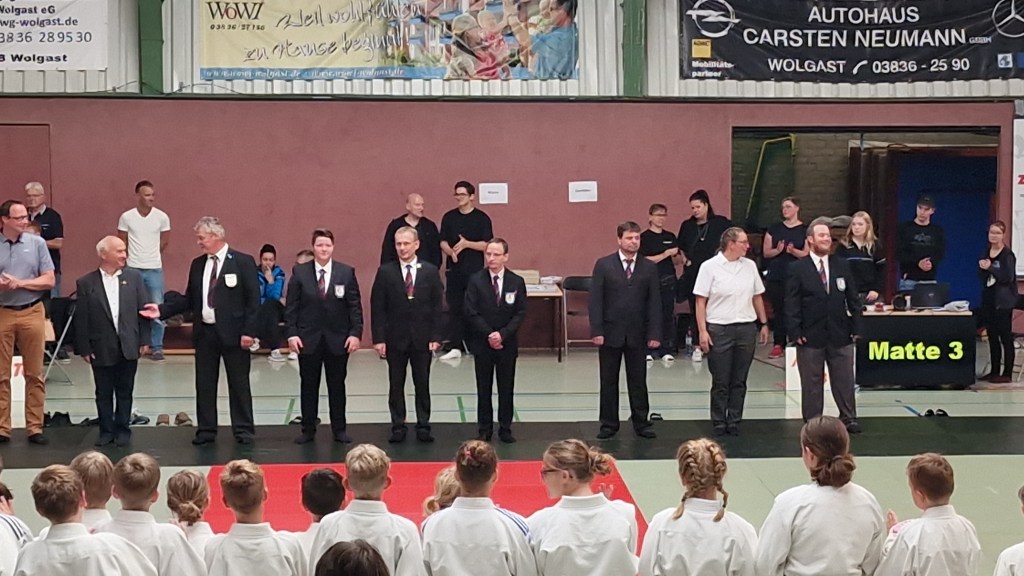 Vor Wettkampfbeginn wurden einige unserer Vereinsmitglieder mit der Ehrennadel in Bronze und Gold des JVMV für ihre ehrenamtliche Arbeit im Verein und für den Judosport ausgezeichnet. Für die Ehrung reiste der Landesverband-Präsident Holm Kolata persönlich an. Bronze und ein herzliches Dankeschön an Sandy Guse, Vaceslav Cagava, Udo Züge, Maik Raunick und Christina Züge.